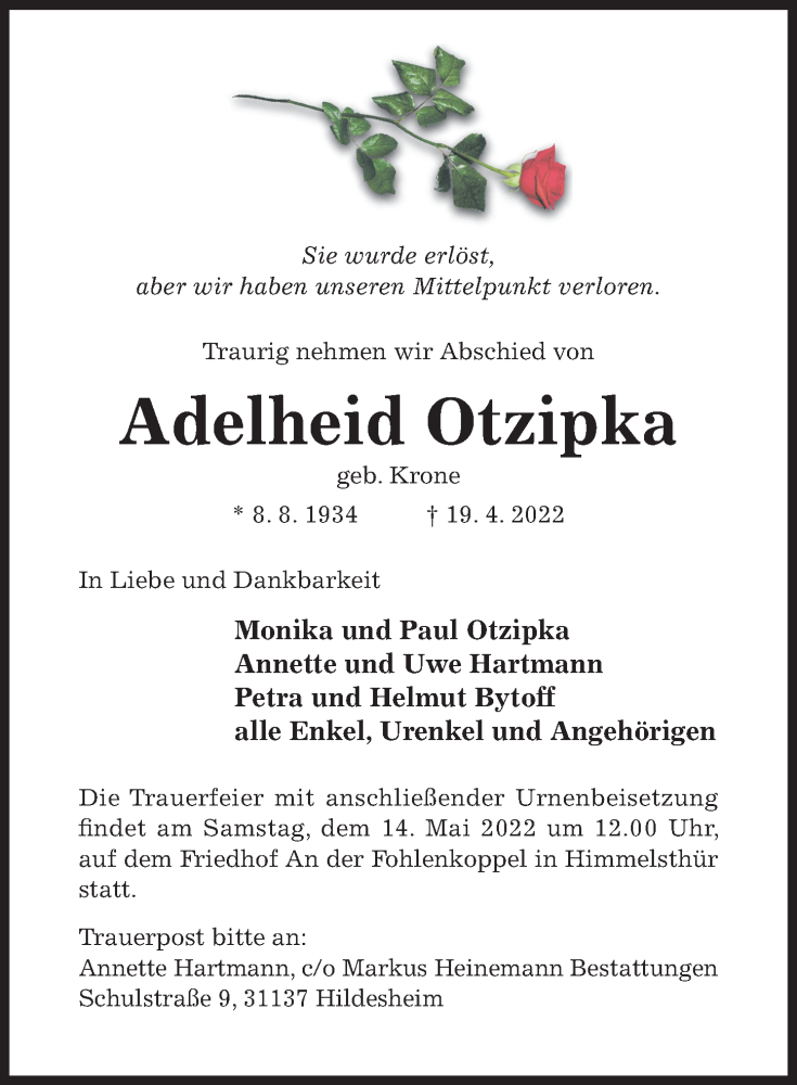 Hier finden Sie alle Traueranzeigen aus der Zeitung, die bisher für Adelheid Otzipka erschienen sind. Weitere Traueranzeigen, die in der Zeitung erscheinen, werden hier ebenfalls aufgelistet