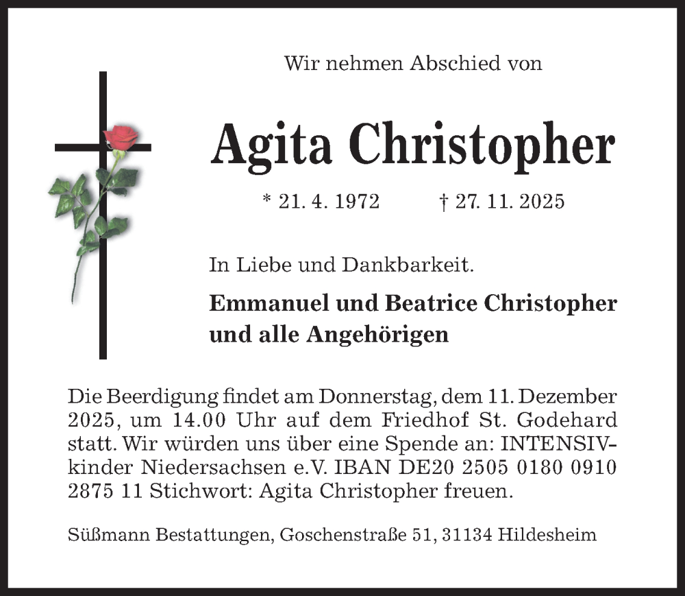 Hier finden Sie alle Traueranzeigen aus der Zeitung, die bisher für Agita Christopher erschienen sind. Weitere Traueranzeigen, die in der Zeitung erscheinen, werden hier ebenfalls aufgelistet