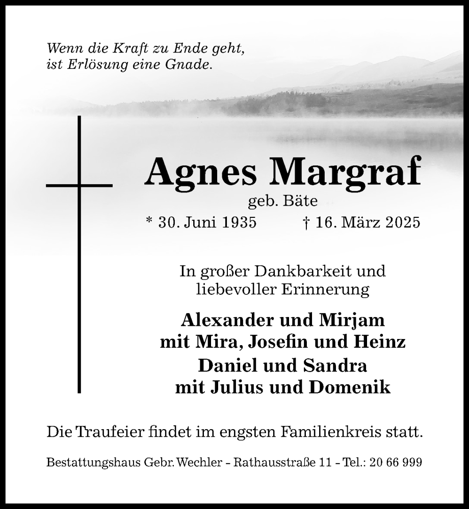 Hier finden Sie alle Traueranzeigen aus der Zeitung, die bisher für Agnes Margraf erschienen sind. Weitere Traueranzeigen, die in der Zeitung erscheinen, werden hier ebenfalls aufgelistet