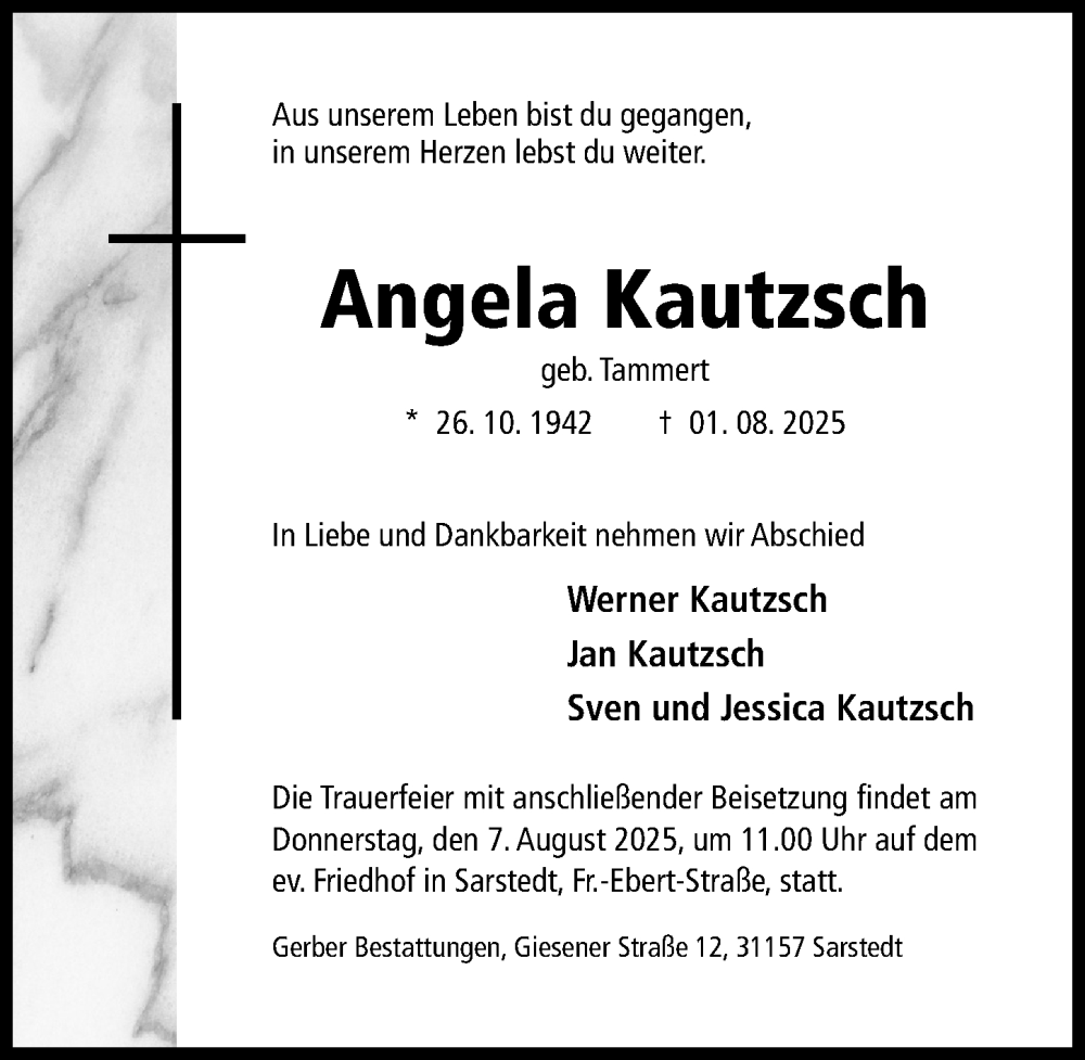 Hier finden Sie alle Traueranzeigen aus der Zeitung, die bisher für Angela Kautzsch erschienen sind. Weitere Traueranzeigen, die in der Zeitung erscheinen, werden hier ebenfalls aufgelistet