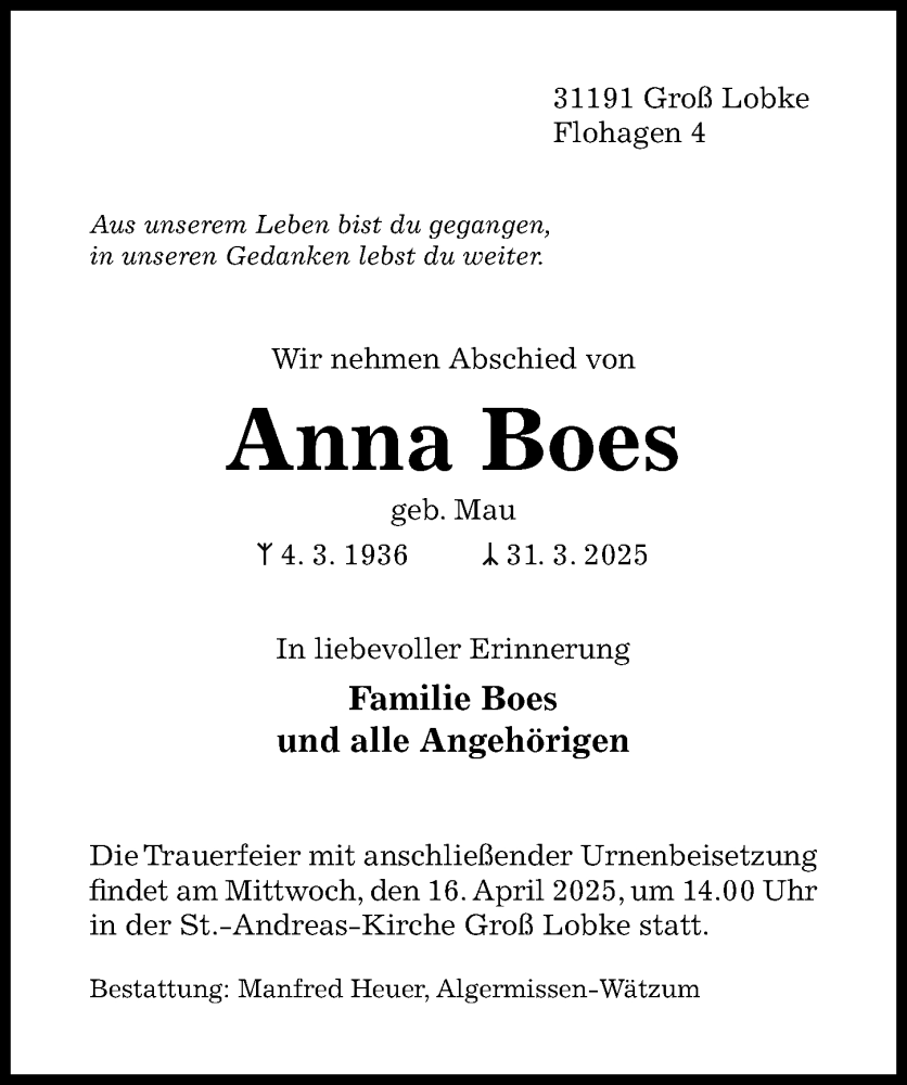 Hier finden Sie alle Traueranzeigen aus der Zeitung, die bisher für Anna Boes erschienen sind. Weitere Traueranzeigen, die in der Zeitung erscheinen, werden hier ebenfalls aufgelistet