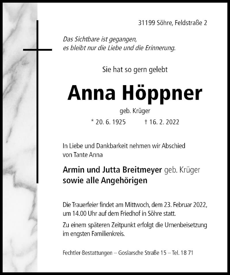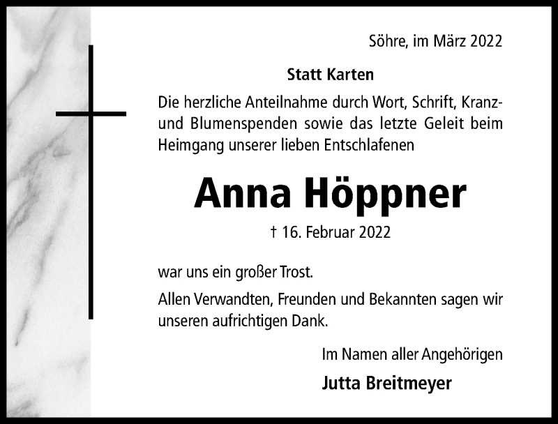Hier finden Sie alle Traueranzeigen aus der Zeitung, die bisher für Anna Höppner erschienen sind. Weitere Traueranzeigen, die in der Zeitung erscheinen, werden hier ebenfalls aufgelistet