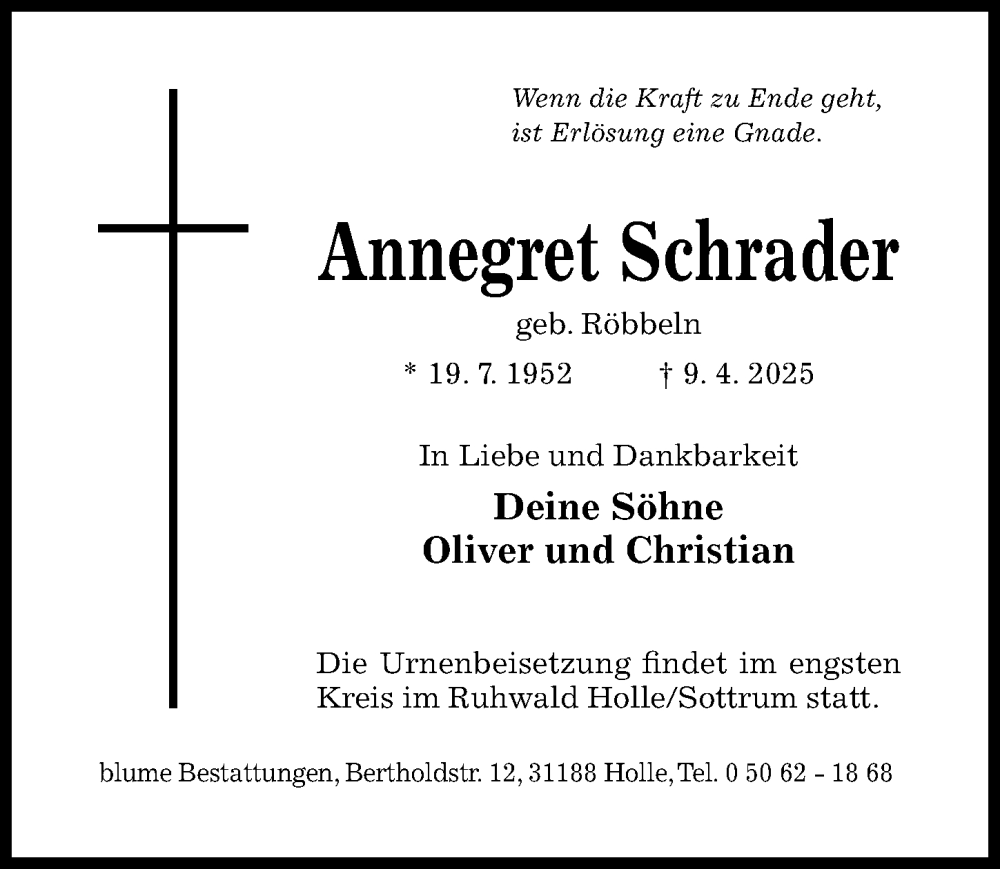 Hier finden Sie alle Traueranzeigen aus der Zeitung, die bisher für Annegret Schrader erschienen sind. Weitere Traueranzeigen, die in der Zeitung erscheinen, werden hier ebenfalls aufgelistet