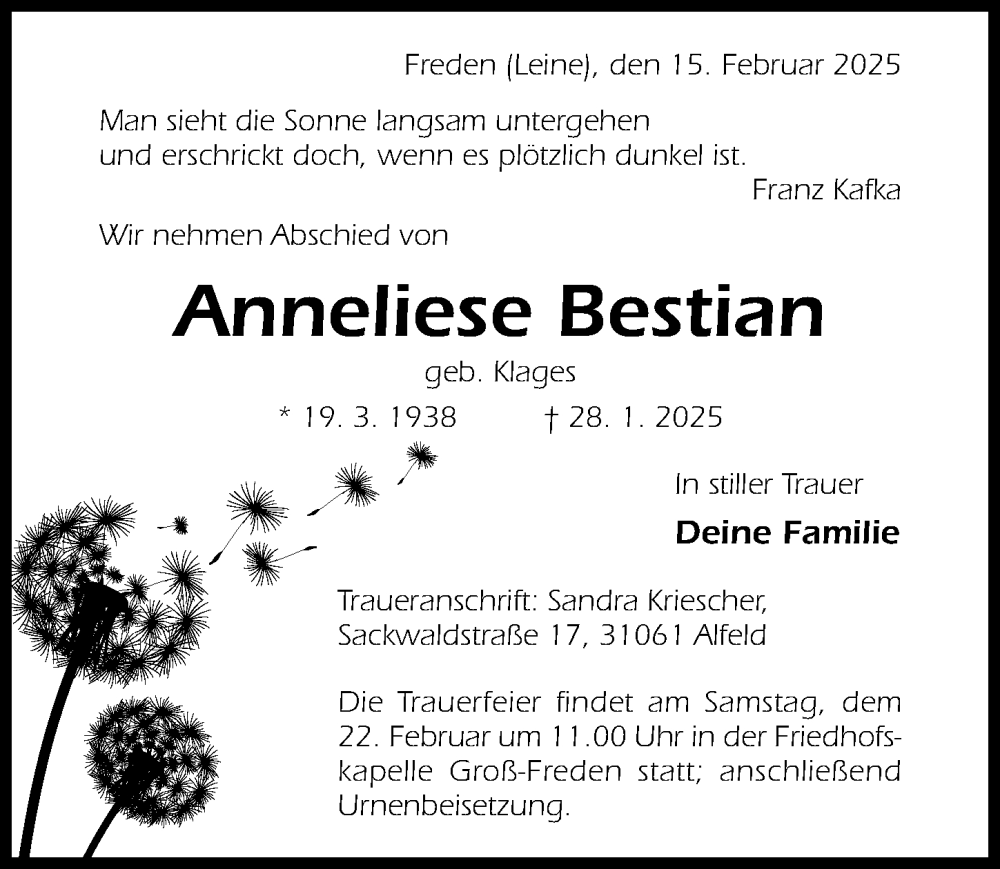 Hier finden Sie alle Traueranzeigen aus der Zeitung, die bisher für Anneliese Bestian erschienen sind. Weitere Traueranzeigen, die in der Zeitung erscheinen, werden hier ebenfalls aufgelistet
