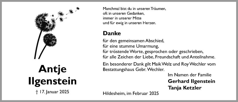 Hier finden Sie alle Traueranzeigen aus der Zeitung, die bisher für Antje Ilgenstein erschienen sind. Weitere Traueranzeigen, die in der Zeitung erscheinen, werden hier ebenfalls aufgelistet