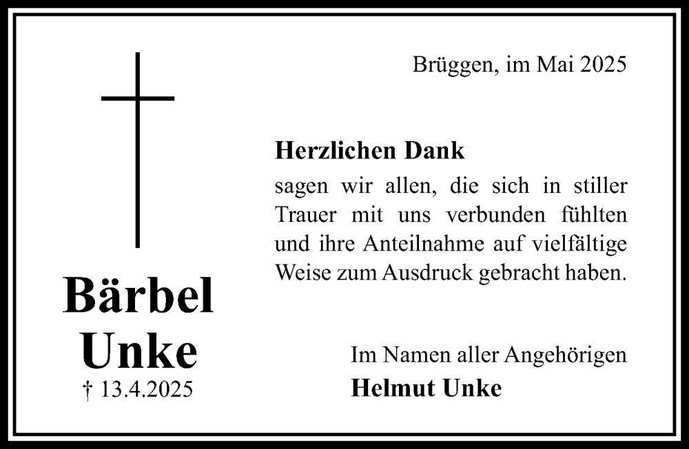 Hier finden Sie alle Traueranzeigen aus der Zeitung, die bisher für Bärbel Unke erschienen sind. Weitere Traueranzeigen, die in der Zeitung erscheinen, werden hier ebenfalls aufgelistet