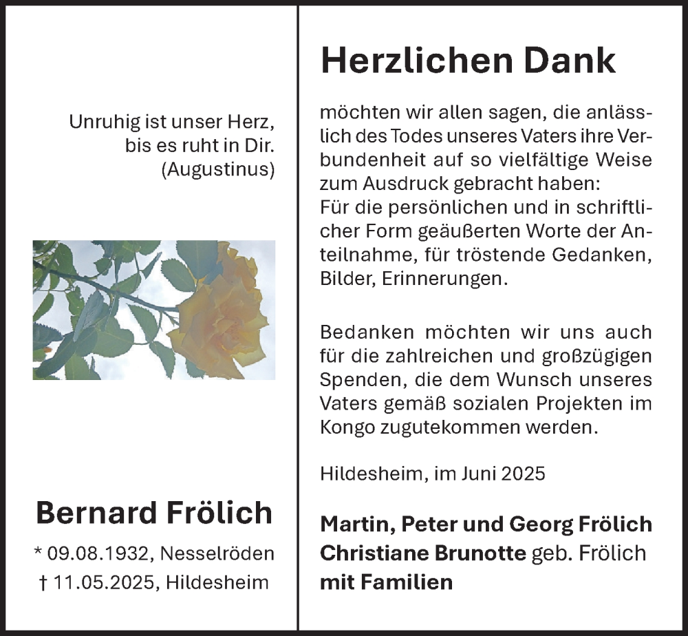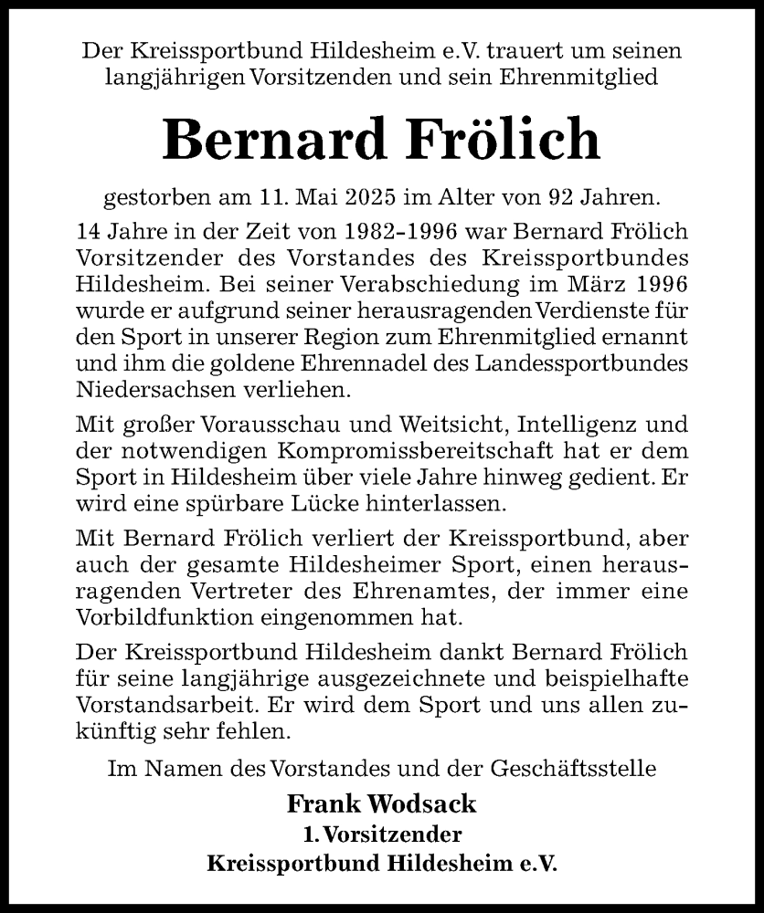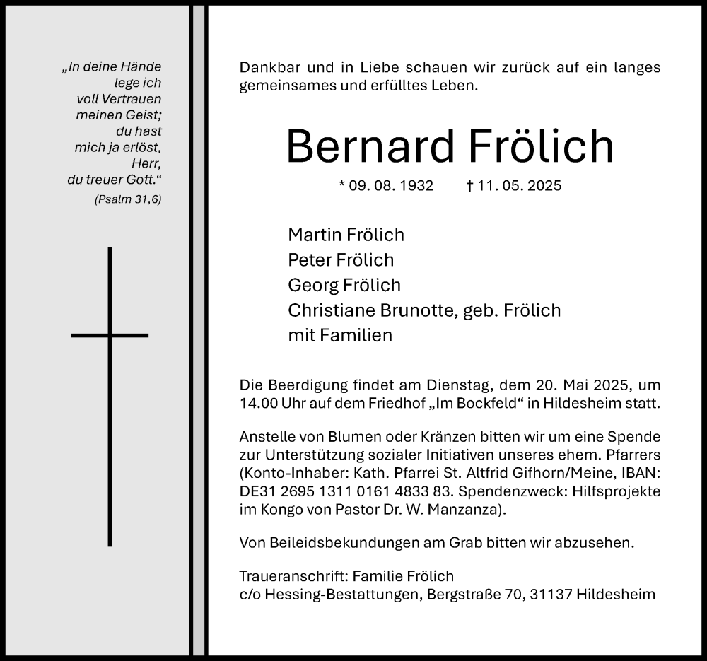 Hier finden Sie alle Traueranzeigen aus der Zeitung, die bisher für Bernard Frölich erschienen sind. Weitere Traueranzeigen, die in der Zeitung erscheinen, werden hier ebenfalls aufgelistet