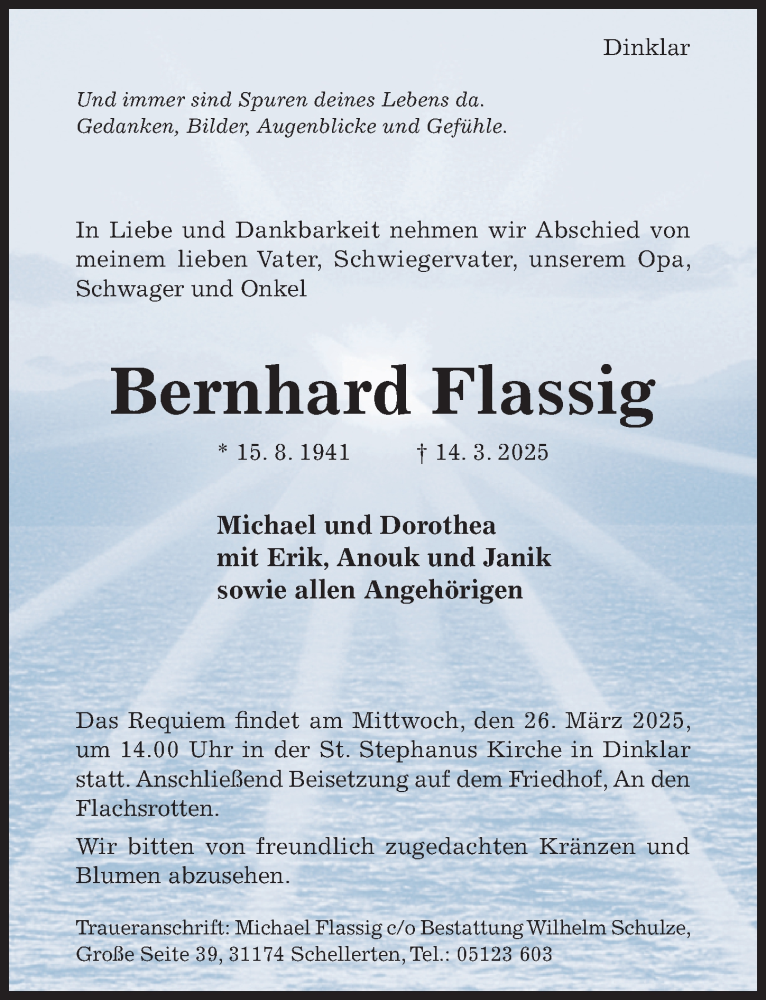 Hier finden Sie alle Traueranzeigen aus der Zeitung, die bisher für Bernhard Flassig erschienen sind. Weitere Traueranzeigen, die in der Zeitung erscheinen, werden hier ebenfalls aufgelistet