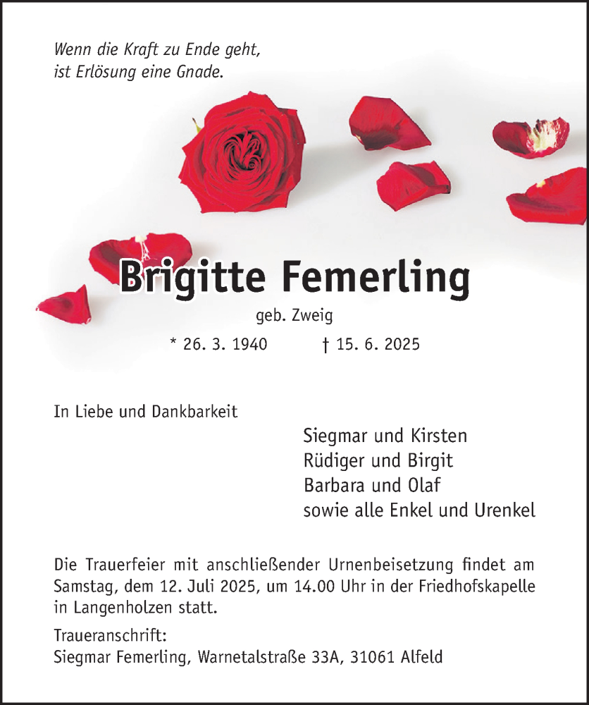 Hier finden Sie alle Traueranzeigen aus der Zeitung, die bisher für Brigitte Femerling erschienen sind. Weitere Traueranzeigen, die in der Zeitung erscheinen, werden hier ebenfalls aufgelistet