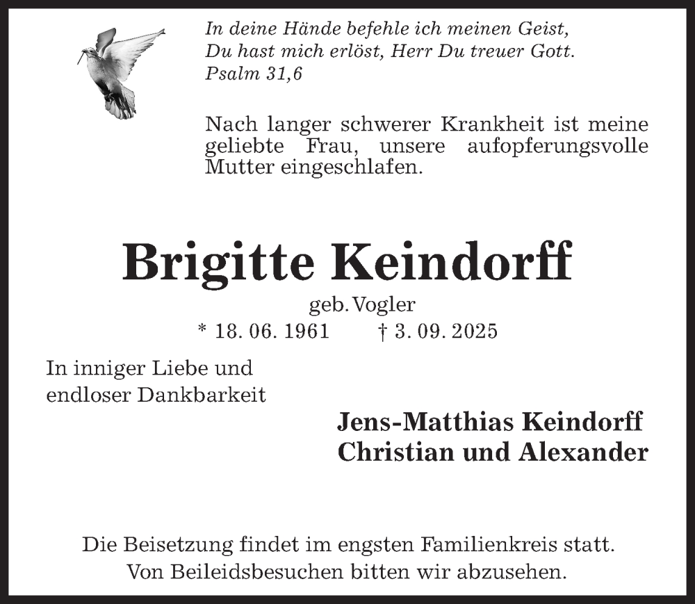 Hier finden Sie alle Traueranzeigen aus der Zeitung, die bisher für Brigitte Keindorff erschienen sind. Weitere Traueranzeigen, die in der Zeitung erscheinen, werden hier ebenfalls aufgelistet