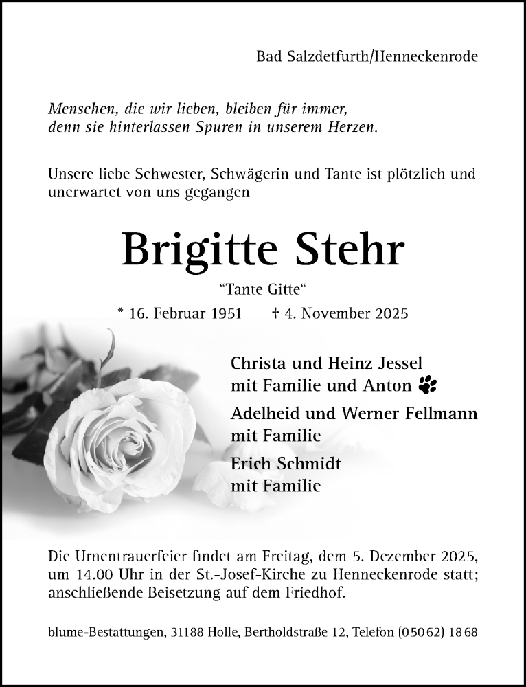 Hier finden Sie alle Traueranzeigen aus der Zeitung, die bisher für Brigitte Stehr erschienen sind. Weitere Traueranzeigen, die in der Zeitung erscheinen, werden hier ebenfalls aufgelistet