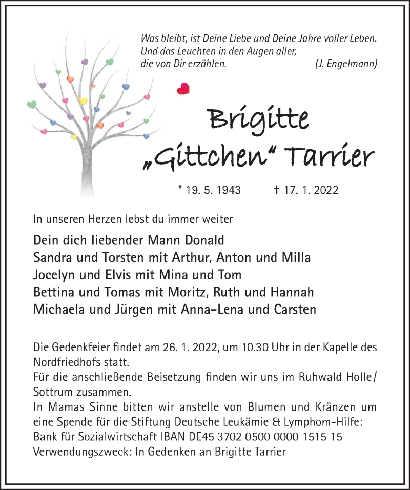 Hier finden Sie alle Traueranzeigen aus der Zeitung, die bisher für Brigitte Tarrier erschienen sind. Weitere Traueranzeigen, die in der Zeitung erscheinen, werden hier ebenfalls aufgelistet