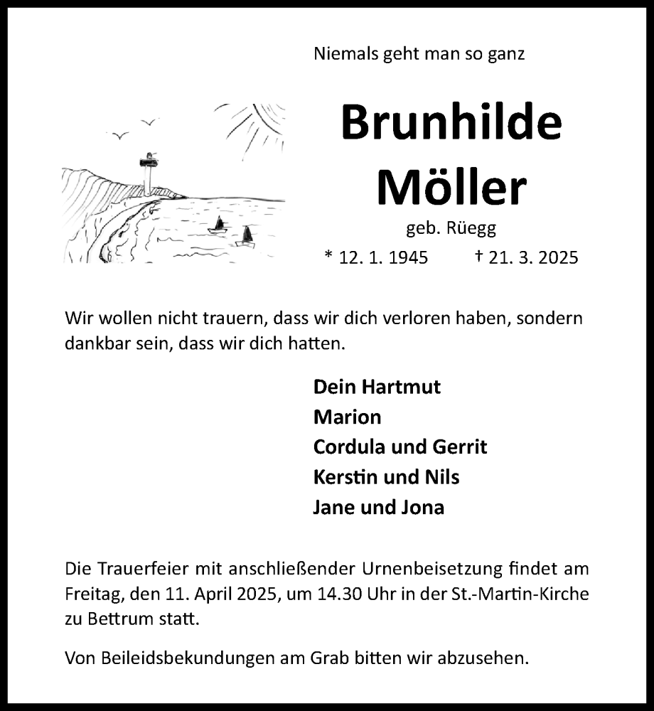 Hier finden Sie alle Traueranzeigen aus der Zeitung, die bisher für Brunhilde Möller erschienen sind. Weitere Traueranzeigen, die in der Zeitung erscheinen, werden hier ebenfalls aufgelistet