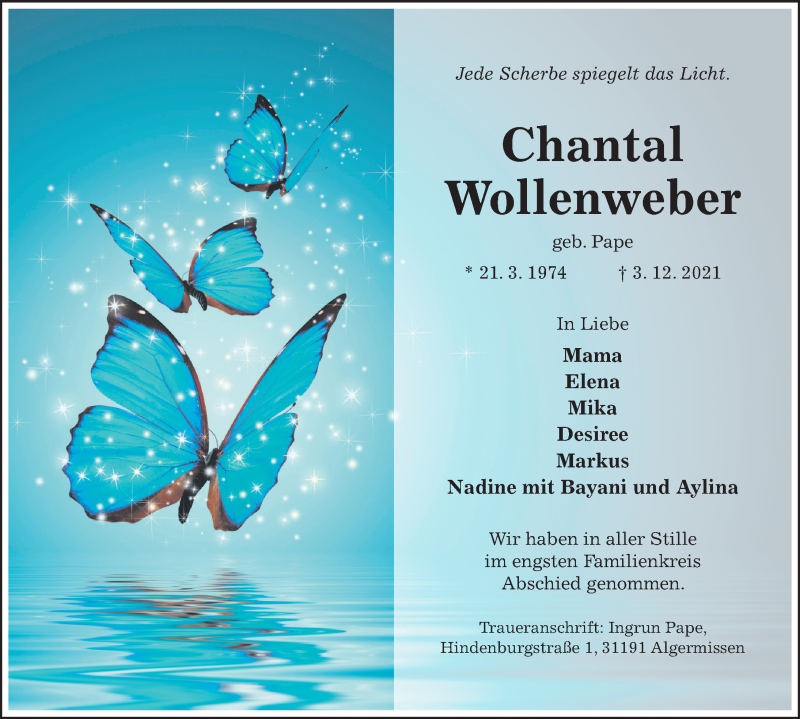 Hier finden Sie alle Traueranzeigen aus der Zeitung, die bisher für Chantal Wollenweber erschienen sind. Weitere Traueranzeigen, die in der Zeitung erscheinen, werden hier ebenfalls aufgelistet