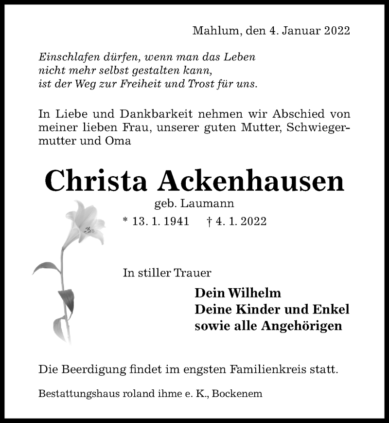 Hier finden Sie alle Traueranzeigen aus der Zeitung, die bisher für Christa Ackenhausen erschienen sind. Weitere Traueranzeigen, die in der Zeitung erscheinen, werden hier ebenfalls aufgelistet