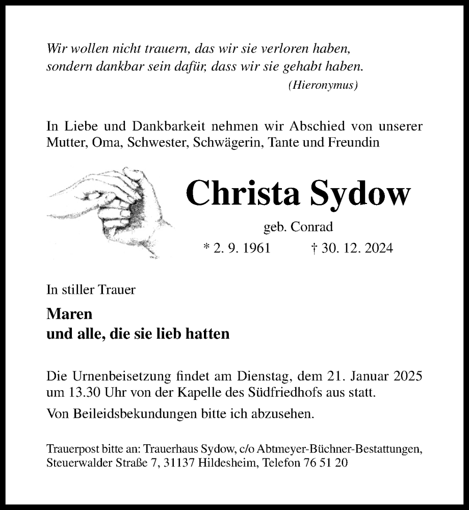Hier finden Sie alle Traueranzeigen aus der Zeitung, die bisher für Christa Sydow erschienen sind. Weitere Traueranzeigen, die in der Zeitung erscheinen, werden hier ebenfalls aufgelistet