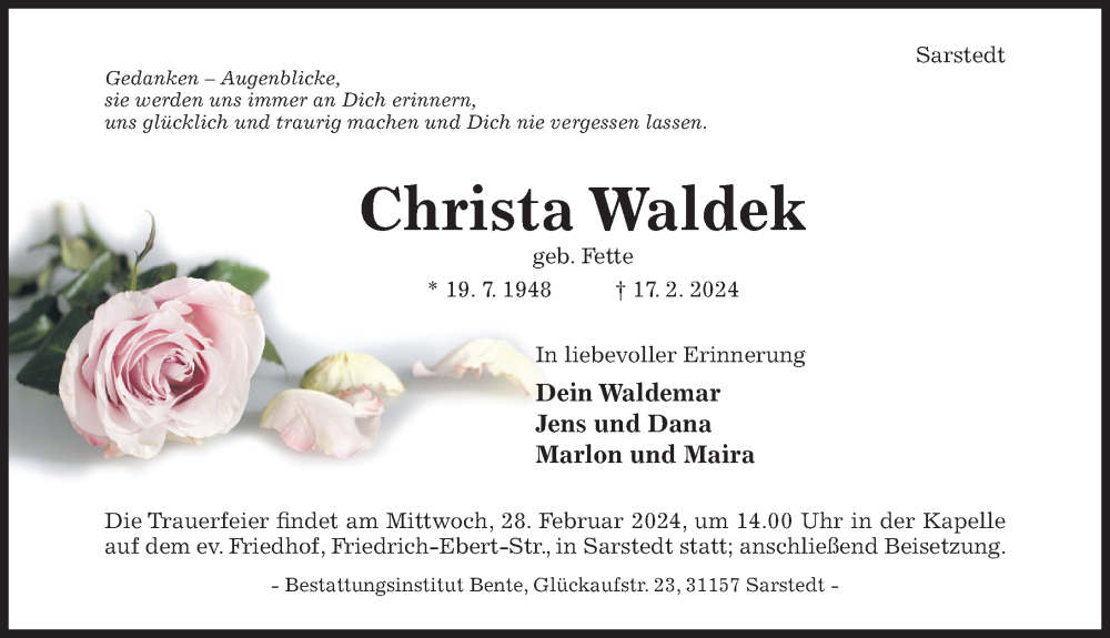 Hier finden Sie alle Traueranzeigen aus der Zeitung, die bisher für Christa Waldek erschienen sind. Weitere Traueranzeigen, die in der Zeitung erscheinen, werden hier ebenfalls aufgelistet