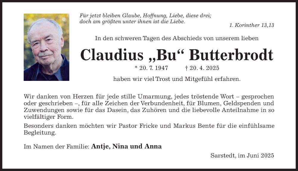 Hier finden Sie alle Traueranzeigen aus der Zeitung, die bisher für Claudius Butterbrodt erschienen sind. Weitere Traueranzeigen, die in der Zeitung erscheinen, werden hier ebenfalls aufgelistet