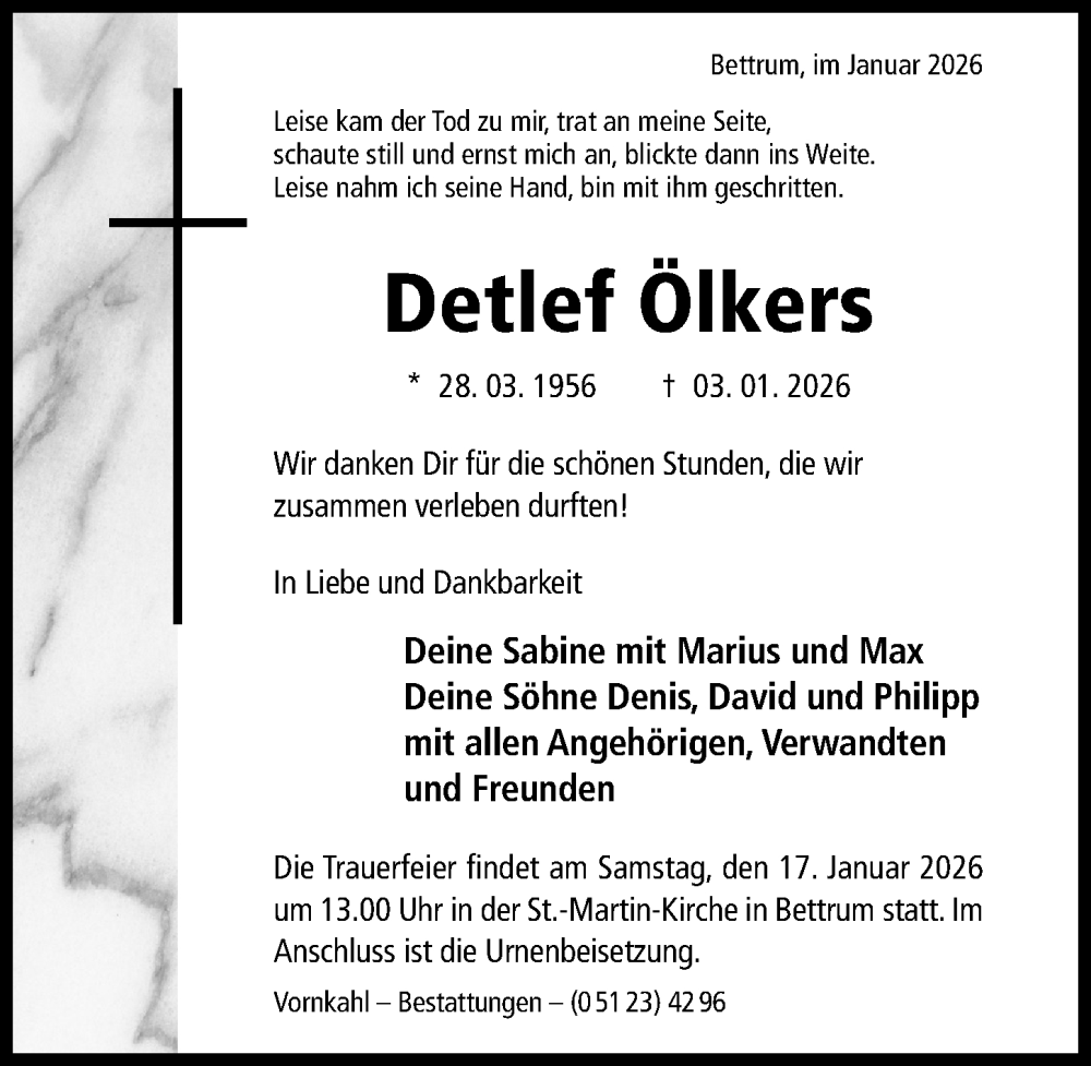 Hier finden Sie alle Traueranzeigen aus der Zeitung, die bisher für Detlef Ölkers erschienen sind. Weitere Traueranzeigen, die in der Zeitung erscheinen, werden hier ebenfalls aufgelistet
