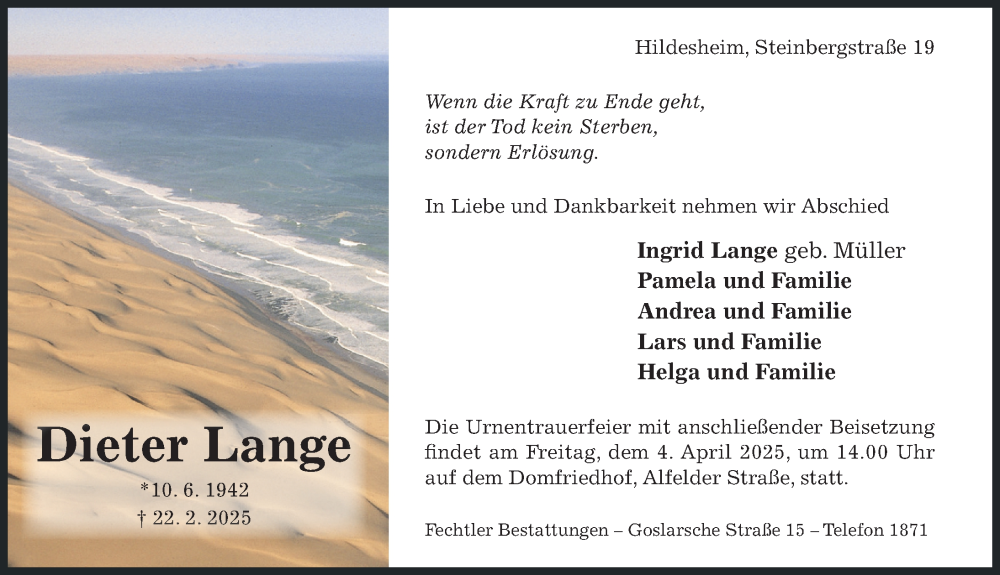 Hier finden Sie alle Traueranzeigen aus der Zeitung, die bisher für Dieter Lange erschienen sind. Weitere Traueranzeigen, die in der Zeitung erscheinen, werden hier ebenfalls aufgelistet