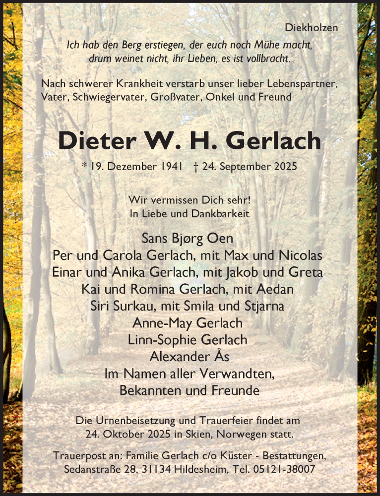 Hier finden Sie alle Traueranzeigen aus der Zeitung, die bisher für Dieter W. H. Gerlach erschienen sind. Weitere Traueranzeigen, die in der Zeitung erscheinen, werden hier ebenfalls aufgelistet