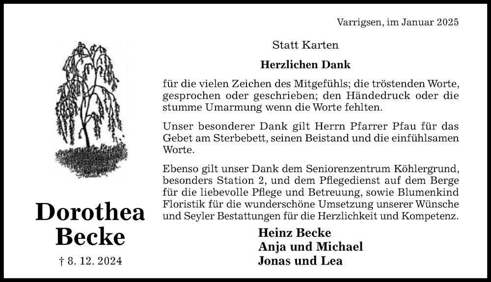 Hier finden Sie alle Traueranzeigen aus der Zeitung, die bisher für Dorothea Becke erschienen sind. Weitere Traueranzeigen, die in der Zeitung erscheinen, werden hier ebenfalls aufgelistet