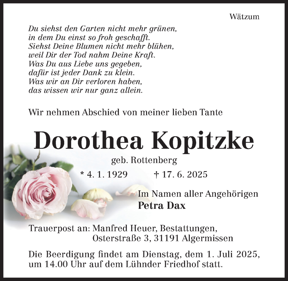 Hier finden Sie alle Traueranzeigen aus der Zeitung, die bisher für Dorothea Kopitzke erschienen sind. Weitere Traueranzeigen, die in der Zeitung erscheinen, werden hier ebenfalls aufgelistet