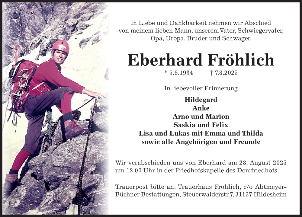 Hier finden Sie alle Traueranzeigen aus der Zeitung, die bisher für Eberhard Fröhlich erschienen sind. Weitere Traueranzeigen, die in der Zeitung erscheinen, werden hier ebenfalls aufgelistet