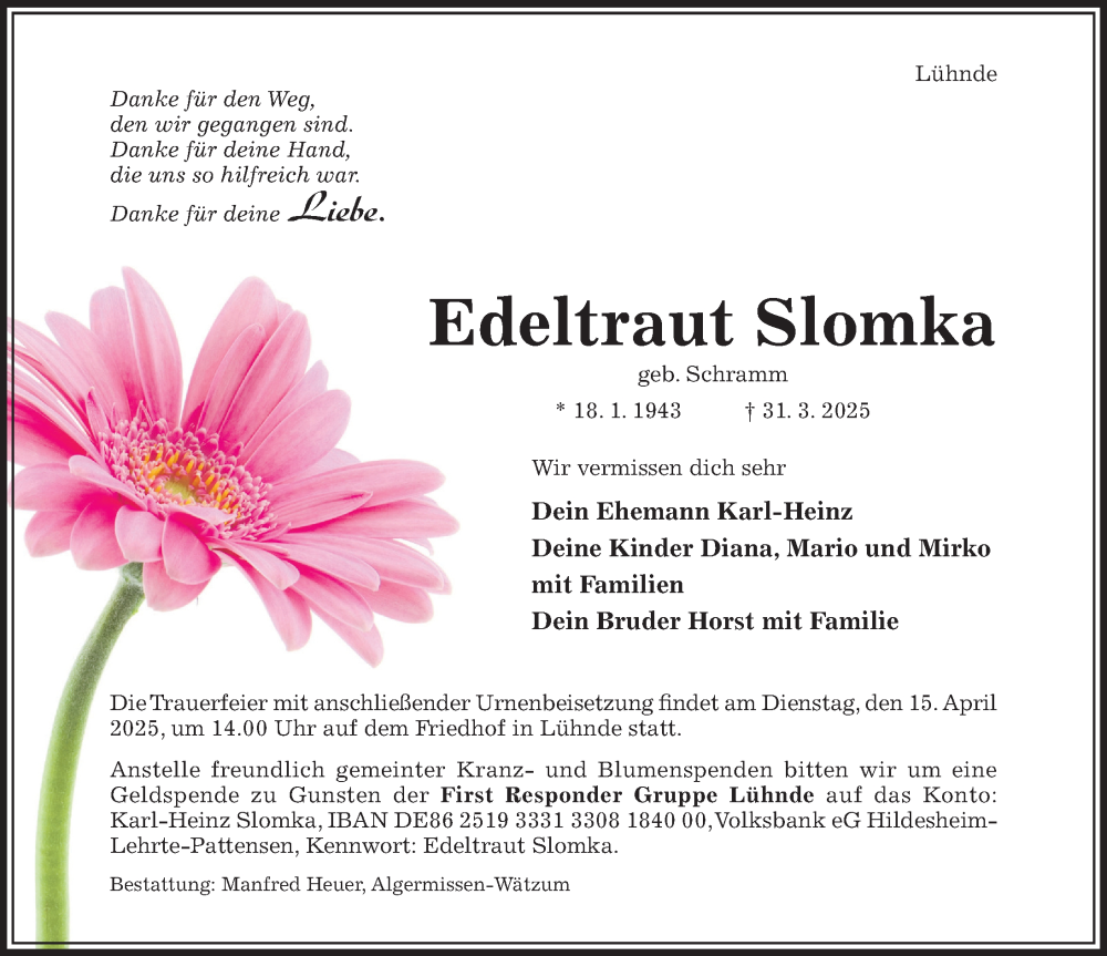 Hier finden Sie alle Traueranzeigen aus der Zeitung, die bisher für Edeltraut Slomka erschienen sind. Weitere Traueranzeigen, die in der Zeitung erscheinen, werden hier ebenfalls aufgelistet