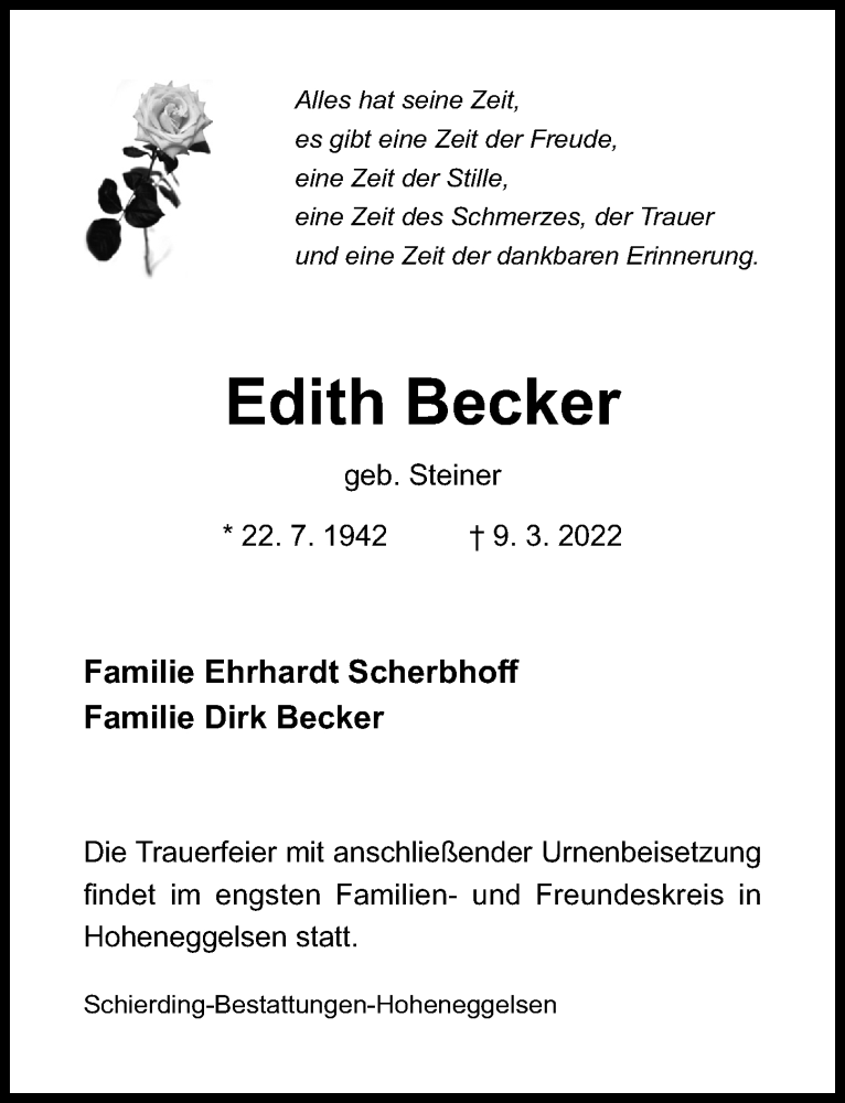 Hier finden Sie alle Traueranzeigen aus der Zeitung, die bisher für Edith Becker erschienen sind. Weitere Traueranzeigen, die in der Zeitung erscheinen, werden hier ebenfalls aufgelistet