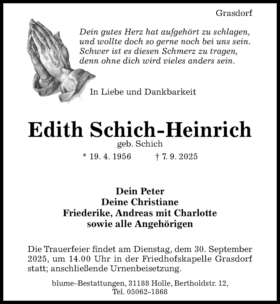 Hier finden Sie alle Traueranzeigen aus der Zeitung, die bisher für Edith Schich-Heinrich erschienen sind. Weitere Traueranzeigen, die in der Zeitung erscheinen, werden hier ebenfalls aufgelistet