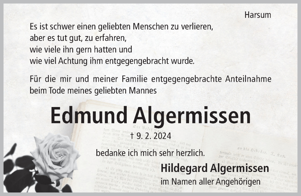 Hier finden Sie alle Traueranzeigen aus der Zeitung, die bisher für Edmund Algermissen erschienen sind. Weitere Traueranzeigen, die in der Zeitung erscheinen, werden hier ebenfalls aufgelistet