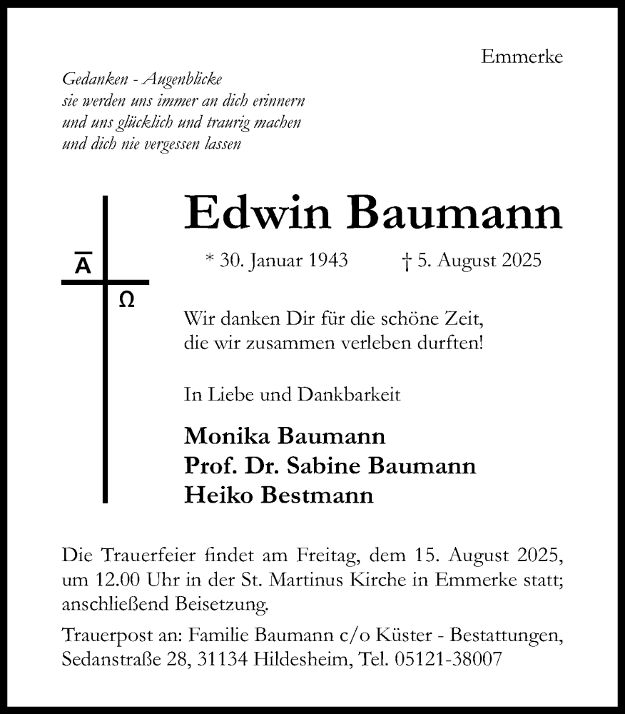 Hier finden Sie alle Traueranzeigen aus der Zeitung, die bisher für Edwin Baumann erschienen sind. Weitere Traueranzeigen, die in der Zeitung erscheinen, werden hier ebenfalls aufgelistet