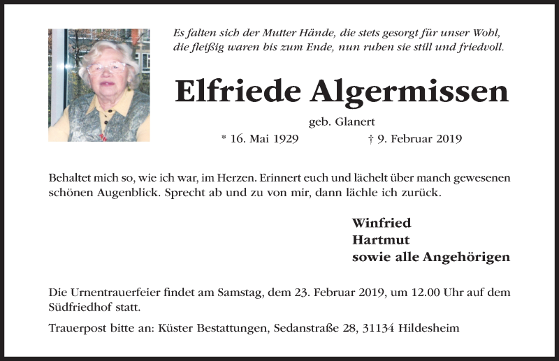 Hier finden Sie alle Traueranzeigen aus der Zeitung, die bisher für Elfriede Algermissen erschienen sind. Weitere Traueranzeigen, die in der Zeitung erscheinen, werden hier ebenfalls aufgelistet