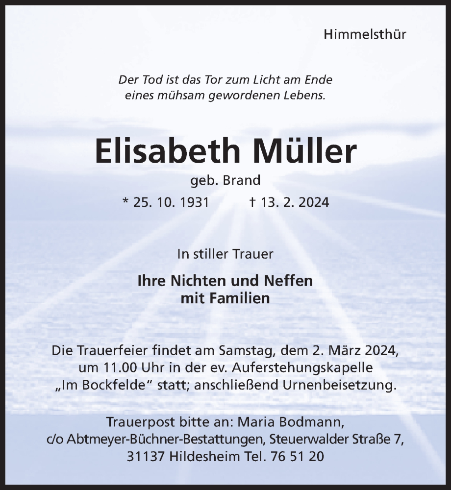 Hier finden Sie alle Traueranzeigen aus der Zeitung, die bisher für Elisabeth Müller erschienen sind. Weitere Traueranzeigen, die in der Zeitung erscheinen, werden hier ebenfalls aufgelistet