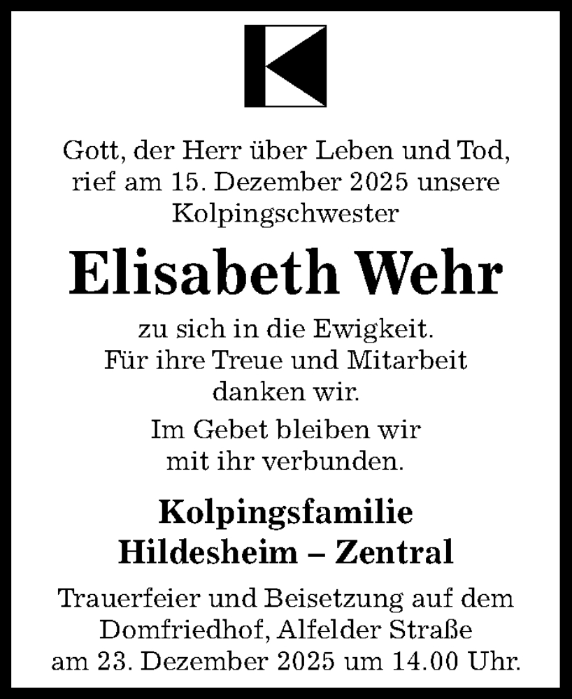 Hier finden Sie alle Traueranzeigen aus der Zeitung, die bisher für Elisabeth Wehr erschienen sind. Weitere Traueranzeigen, die in der Zeitung erscheinen, werden hier ebenfalls aufgelistet