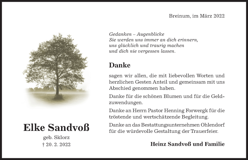 Hier finden Sie alle Traueranzeigen aus der Zeitung, die bisher für Elke Sandvoß erschienen sind. Weitere Traueranzeigen, die in der Zeitung erscheinen, werden hier ebenfalls aufgelistet