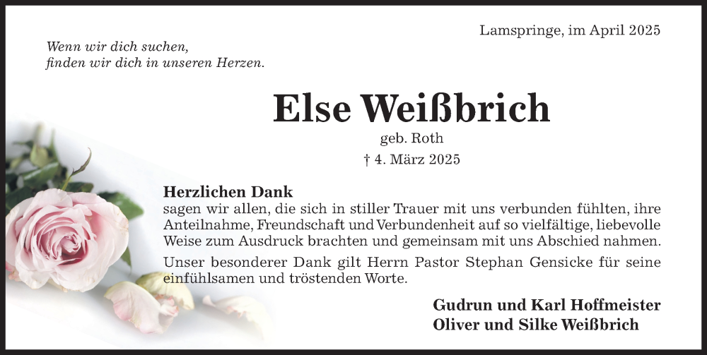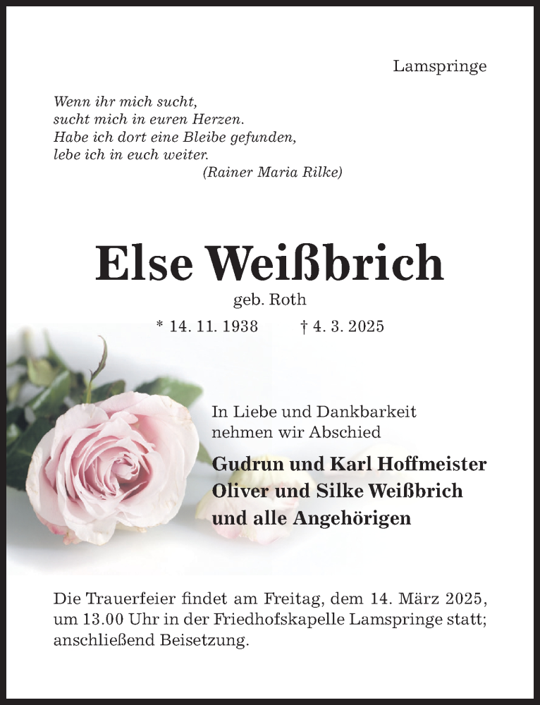 Hier finden Sie alle Traueranzeigen aus der Zeitung, die bisher für Else Weißbrich erschienen sind. Weitere Traueranzeigen, die in der Zeitung erscheinen, werden hier ebenfalls aufgelistet