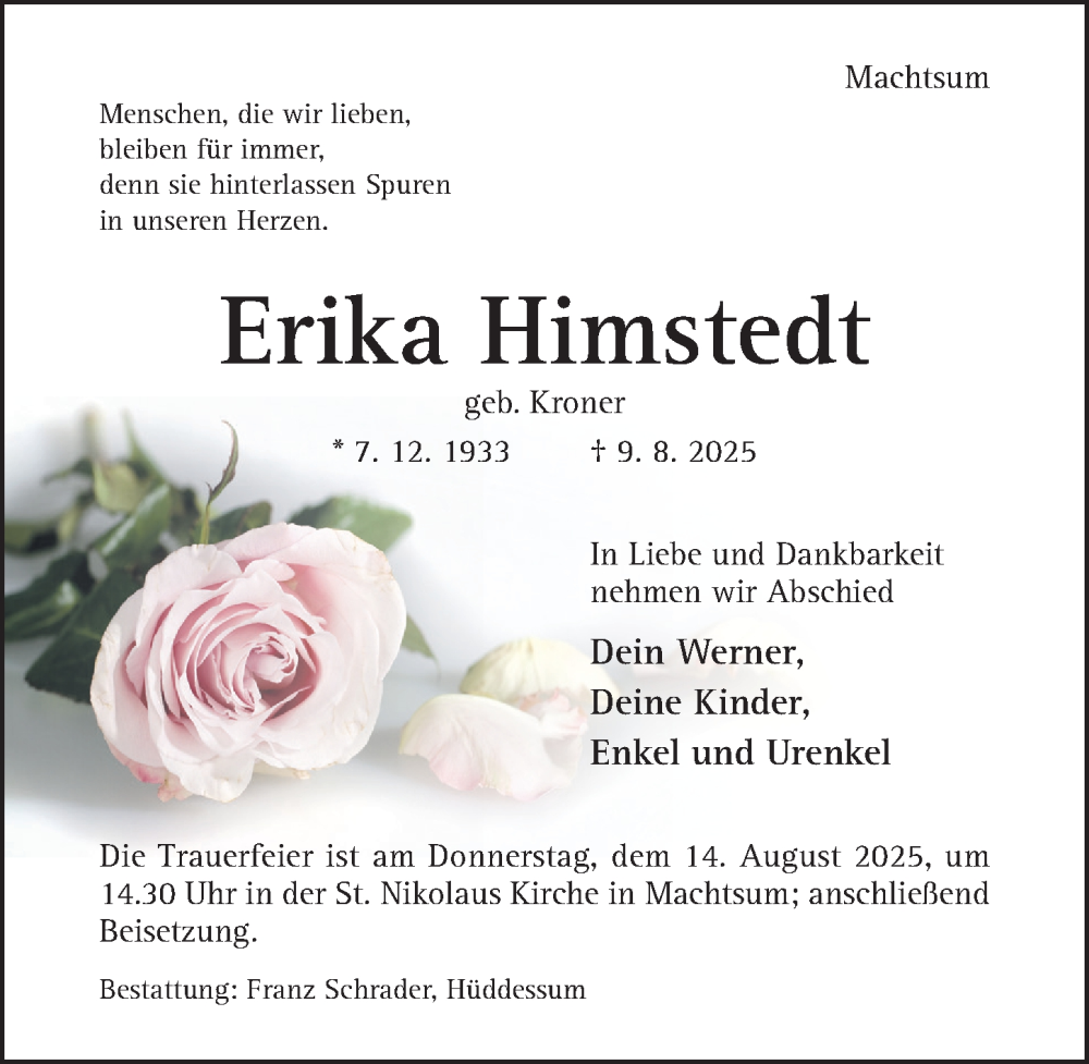 Hier finden Sie alle Traueranzeigen aus der Zeitung, die bisher für Erika Himstedt erschienen sind. Weitere Traueranzeigen, die in der Zeitung erscheinen, werden hier ebenfalls aufgelistet