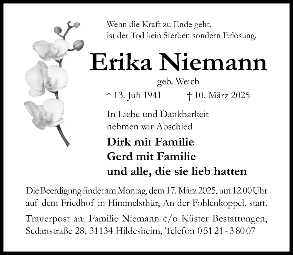 Hier finden Sie alle Traueranzeigen aus der Zeitung, die bisher für Erika Niemann erschienen sind. Weitere Traueranzeigen, die in der Zeitung erscheinen, werden hier ebenfalls aufgelistet