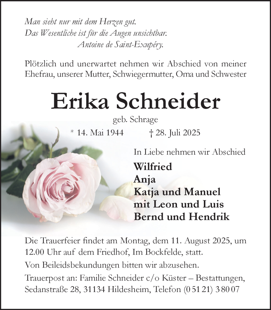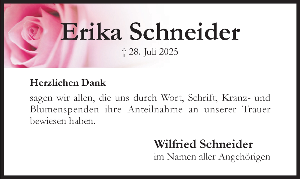 Hier finden Sie alle Traueranzeigen aus der Zeitung, die bisher für Erika Schneider erschienen sind. Weitere Traueranzeigen, die in der Zeitung erscheinen, werden hier ebenfalls aufgelistet