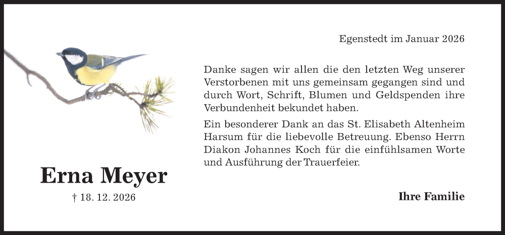 Hier finden Sie alle Traueranzeigen aus der Zeitung, die bisher für Erna Meyer erschienen sind. Weitere Traueranzeigen, die in der Zeitung erscheinen, werden hier ebenfalls aufgelistet
