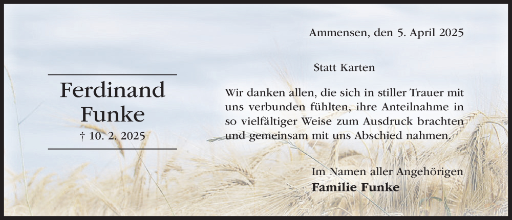 Hier finden Sie alle Traueranzeigen aus der Zeitung, die bisher für Ferdinand Funke erschienen sind. Weitere Traueranzeigen, die in der Zeitung erscheinen, werden hier ebenfalls aufgelistet