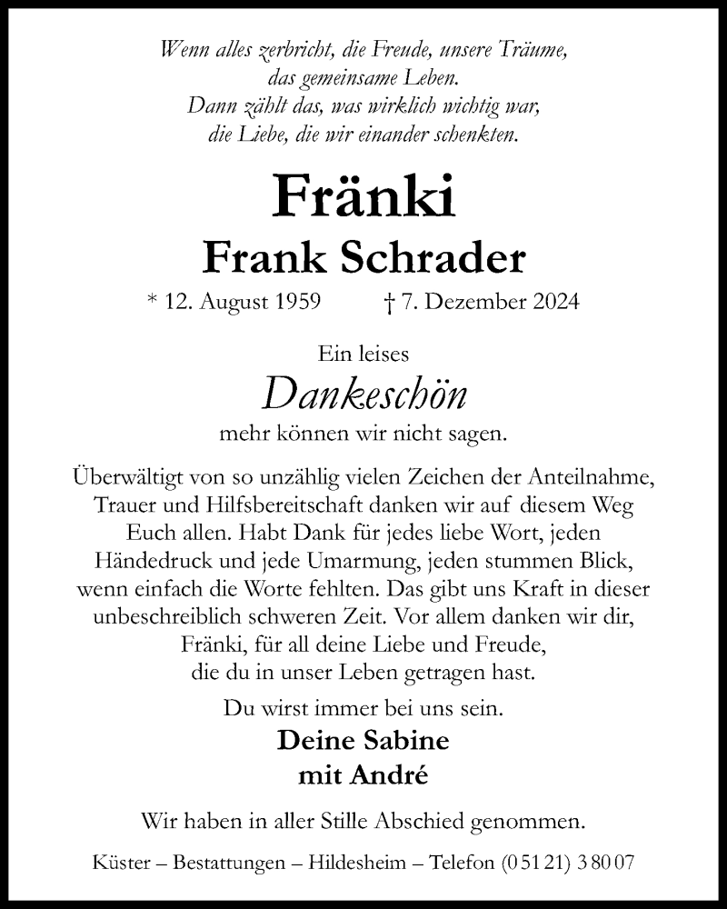 Hier finden Sie alle Traueranzeigen aus der Zeitung, die bisher für Frank Schrader erschienen sind. Weitere Traueranzeigen, die in der Zeitung erscheinen, werden hier ebenfalls aufgelistet