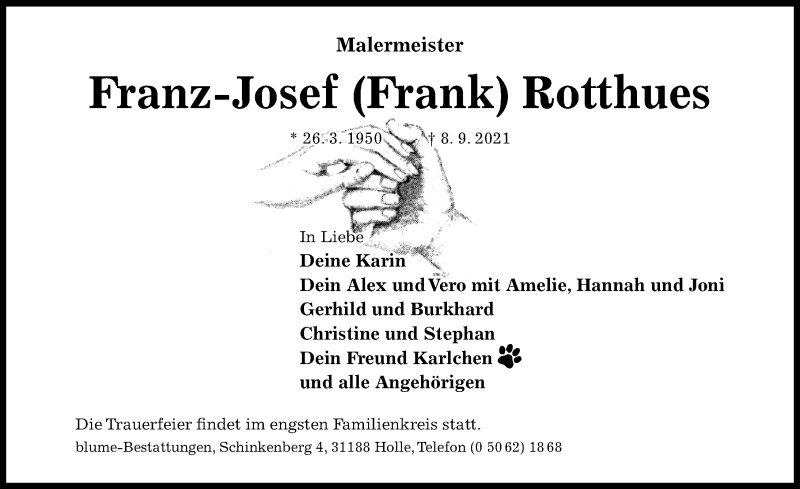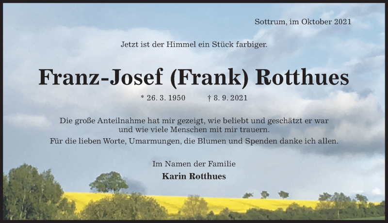 Hier finden Sie alle Traueranzeigen aus der Zeitung, die bisher für Franz-Josef Rotthues erschienen sind. Weitere Traueranzeigen, die in der Zeitung erscheinen, werden hier ebenfalls aufgelistet