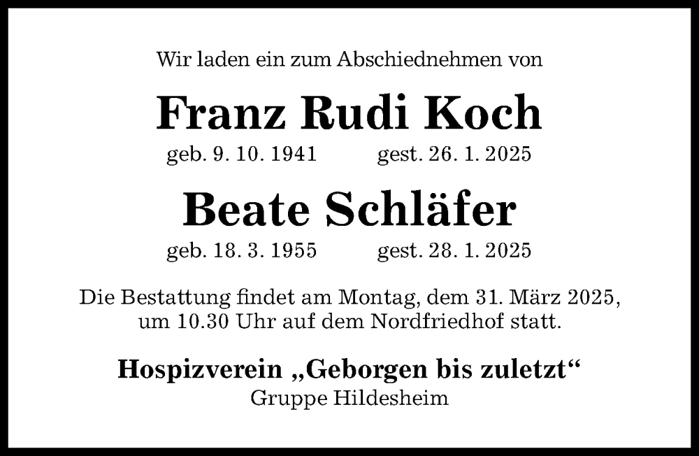 Hier finden Sie alle Traueranzeigen aus der Zeitung, die bisher für Franz Rudi Koch erschienen sind. Weitere Traueranzeigen, die in der Zeitung erscheinen, werden hier ebenfalls aufgelistet