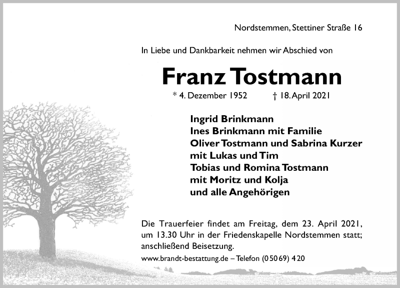 Hier finden Sie alle Traueranzeigen aus der Zeitung, die bisher für Franz Tostmann erschienen sind. Weitere Traueranzeigen, die in der Zeitung erscheinen, werden hier ebenfalls aufgelistet