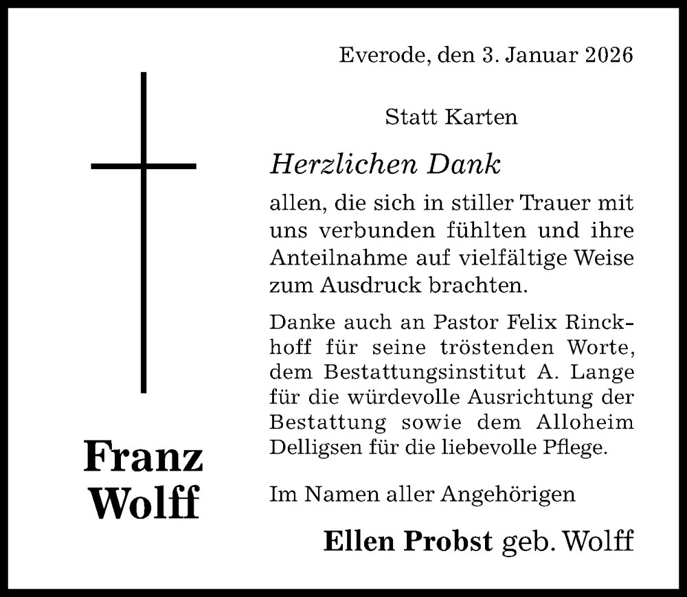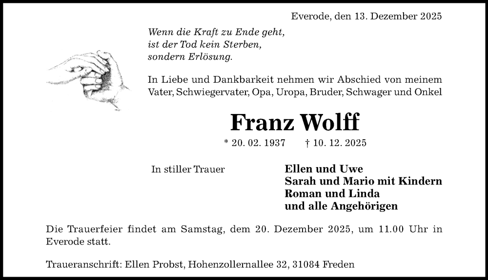 Hier finden Sie alle Traueranzeigen aus der Zeitung, die bisher für Franz Wolff erschienen sind. Weitere Traueranzeigen, die in der Zeitung erscheinen, werden hier ebenfalls aufgelistet