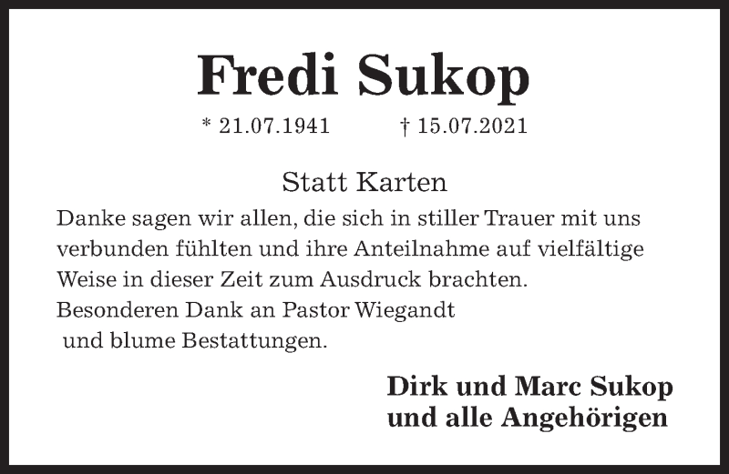 Hier finden Sie alle Traueranzeigen aus der Zeitung, die bisher für Fredi Sukop erschienen sind. Weitere Traueranzeigen, die in der Zeitung erscheinen, werden hier ebenfalls aufgelistet