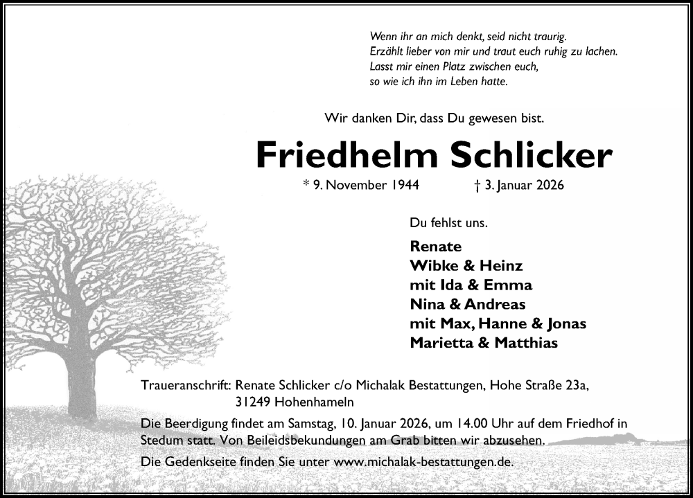 Hier finden Sie alle Traueranzeigen aus der Zeitung, die bisher für Friedhelm Schlicker erschienen sind. Weitere Traueranzeigen, die in der Zeitung erscheinen, werden hier ebenfalls aufgelistet